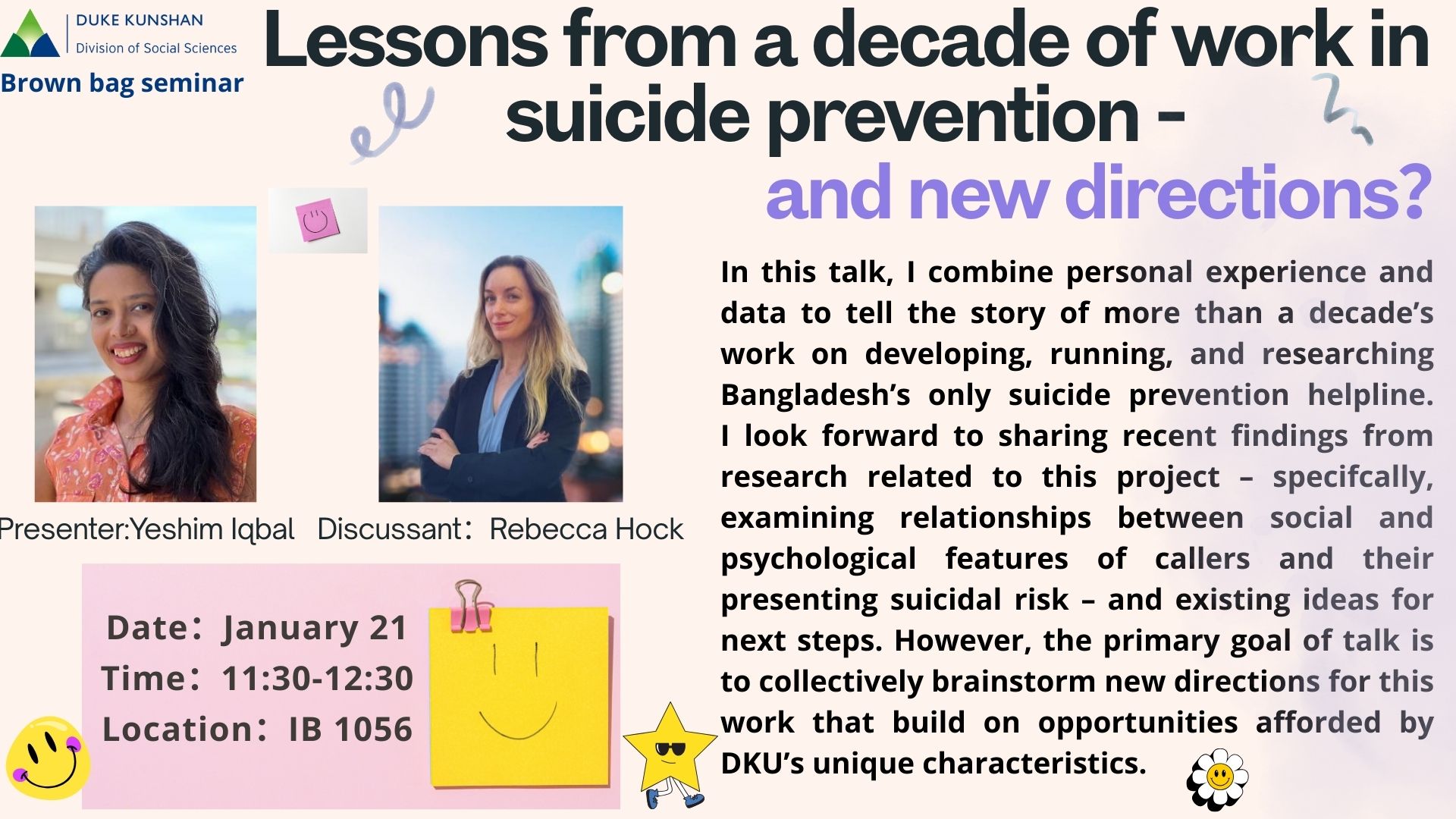 In this talk, I combine personal experience and data to tell the story of more than a decade’s work on developing, running, and researching Bangladesh’s only suicide prevention helpline. I look forward to sharing recent findings from research related to this project – specifcally, examining relationships between social and psychological features of callers and their presenting suicidal risk – and existing ideas for next steps. However, the primary goal of talk is to collectively brainstorm new directions for this work that build on opportunities afforded by DKU’s unique characteristics.