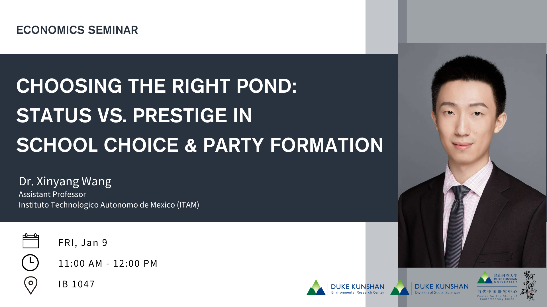 Speaker bio: Xinyang Wang is an Assistant professor of Economics at the center for economic research at the instituto technologico autonomo de Mexico (ITAM). He received his Ph.D. in economics from Yale in 2020, and has held visiting posittions at the Johns Hopkins University and Naples Federico II. He served as a junior associate editor at the Journal of Mathematical Economics, and is on the scentific committee for various conferences including international conference on public economic theory and the central european program in economic theory. He has a diverse research interest in economic theory, including coalition formation, general equilibrium, and dynamics.