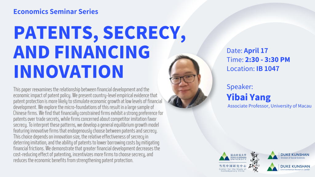 Abstract: This paper reexamines the relationship between financial development and the economic impact of patent policy. We present country-level empirical evidence that patent protection is more likely to stimulate economic growth at low levels of financial development. We explore the micro-foundations of this result in a large sample of Chinese firms. We find that financially constrained firms exhibit a strong preference for patents over trade secrets, while firms concerned about competitor imitation favor secrecy. To interpret these patterns, we develop a general equilibrium growth model featuring innovative firms that endogenously choose between patents and secrecy. This choice depends on innovation size, the relative effectiveness of secrecy in deterring imitation, and the ability of patents to lower borrowing costs by mitigating financial frictions. We demonstrate that greater financial development decreases the cost-reducing effect of patenting, incentivizes more firms to choose secrecy, and reduces the economic benefits from strengthening patent protection.