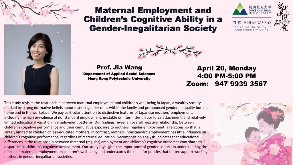 Dr. Jia WANG is an Assistant Professor in the Department of Applied Social Sciences at the Hong Kong Polytechnic University. Her research areas include social stratification and inequality, work and family, health, aging, and the life course, and East Asia. Her research work has been published in leading academic journals including American Journal of Sociology, Demography, European Journal of Population, Social Forces, Journal of Marriage and Family, Social Science Research, Research in Social Stratification and Mobility, among others.