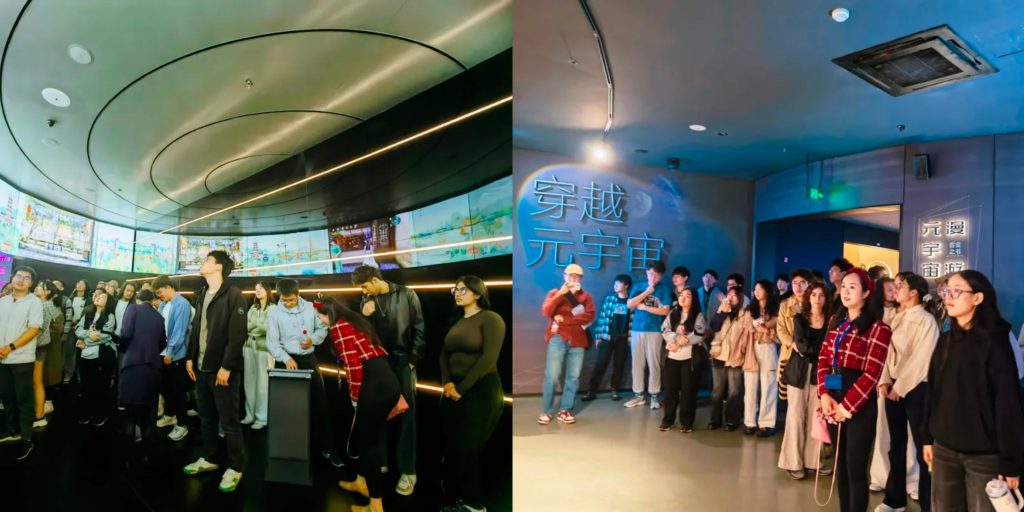In the first part of the activity, students attended Kunshan’s Industrial Metaverse Infrastructure Exhibition. They used their knowledge to bridge the gap between the technology and design aspects of the project by engaging with them on a deep intellectual level. A key part of the exhibition was the transformative benefits of the metaverse for industries and commerce. It showcased the integration of data science, artificial intelligence, and sustainability for smart cities. Indeed, participants gained insights into how machine learning is applied to solve large-scale social science problems, such as reducing waste and improving energy efficiency.