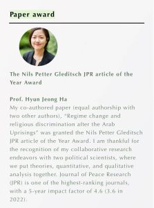 The Nils Petter Gleditsch JPR article of the Year Award Prof. Hyun Jeong HaMy co-authored paper (equal authorship with two other authors), “Regime change and religious discrimination after the Arab Uprisings” was granted the Nils Petter Gleditsch JPR article of the Year Award. I am thankful for the recognition of my collaborative research endeavors with […]