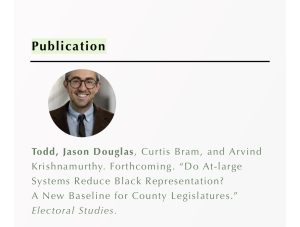 Todd, Jason Douglas, Curtis Bram, and Arvind Krishnamurthy. Forthcoming. “Do At-large Systems Reduce Black Representation? A New Baseline for County Legislatures.” Electoral Studies. BlurbLocal governments affect the lives of their citizens on a daily basis, and it matters who serves. Much work has shown that, at all levels, Black Americans tend to be underrepresented in […]